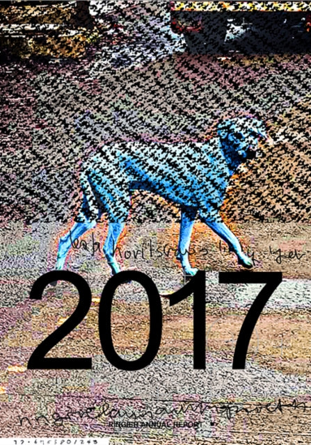 Tiré du site Internet de JRP/Ringier: "Berlin-based Estonian artist Katja Novitskova (b. Tallinn, 1984) is searching for areas where humans, machines, and the environment intersect. Her work focuses on technology, evolutionary processes, digital imagery, and corporate aesthetics. She scans our chaotic reality for meaningful patterns as if she were a biological search engine. Playful and determined, she explores different concepts of artificial intelligence (AI) and considers the nonhuman intelligence of animals as a model for AI. "For me, watching an animal, whether it's a fly or a mouse, an ape or an octopus, is more exciting than watching a movie," Novitskova says. She has looked at countless animal images for this artist's book, a special edition of the Ringier Annual Report 2017. Since 1998, Ringier annual reports have been created by artists whose work is featured in the Ringier Collection. Publisher Michael Ringier and curator Beatrix Ruf initiated the series as a means of firming links between art and the activities of the Swiss-based, global media company Ringier. Novitskova closely collaborated with PWR, a cloud-based design studio with a physical presence in Berlin and Amsterdam. The result is a visual tour de force, that Novitskova calls a "mutant child," with PWR's Hanna Nilsson and Rasmus Svensson as algorithm parents and the artist as content parent. What ended up on the pages was not a conscious choice, but the result of artistry and artificial intelligence. The artist thus opens her on-going archive of digital images making clear the ways she is experimenting with images. "I need to manipulate images to be allowed to use them. I fictionalize everything. It's not fake news, but an interpretation. The images I use stand for themselves - and they are a product of our time. The image itself is already an artifact that needs attention. I try to encapsulate its reality." The publication also includes a wide-ranging interview conducted by Peter Hossli in which Novitskova talks about the artistic power of a blue dog in India ; in what way artificial or machine intelligence relates to her artistic vision ; how she works with scientific representations as well as algorithms ; her Russian-Estonian heritage, and a Soviet childhood."