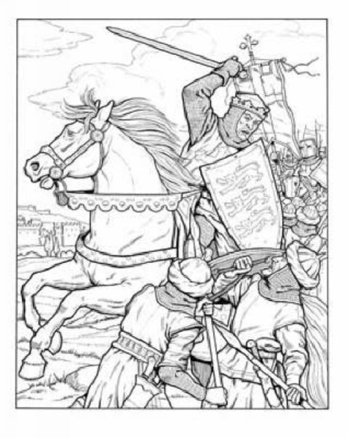 In addition to the two sovereigns mentioned above, you'll also find detailed, well-researched drawings of William the Conqueror (1606-1087) setting sail from France to claim the English throne; Richard I, "the Lionheart" (1189-1199) leading Crusaders into battle; Elizabeth I (1558-1603) at the knighting of Sir Francis Drake aboard the Golden Hind; the execution of Charles I in 1649; and numerous other scenes depicting Richard III, Henry VIII, Mary I ("Bloody Mary"), Queen Victoria, King George VI, and many more.